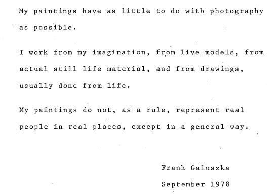 Frank Galuszka studied at Syracuse University and at Tyler School of Art of Temple University. He was a Fulbright Scholar in Romania. Galuszka has had twenty-six solo exhibitions including ten one-person shows at the More Gallery, Philadelphia. He also showed at the Nicolas Roerich Museum, NY, and at the Pennsylvania Academy. He taught at the University of the Arts in Philadelphia from 1974 to1995; at Vermont College of Norwich University, Montpelier; at the Studio School of Painting and Sculpture in New York, at Tyler School of Art in Rome and in Philadelphia, at the Louisiana Tech Studies Center in Rome, and at The Aegean School of Fine Arts in Greece.